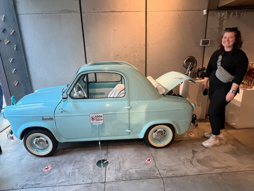Munchkin Car! Vespa 400 in Mexico City Coffee Shop.